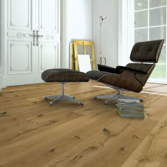 Rustikale 1-Stab Landhausdiele. 14 mm stark. 3 mm Furnier-Auflage. Einfache Dropdown Verlegetechnik.